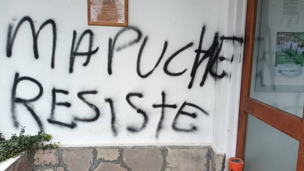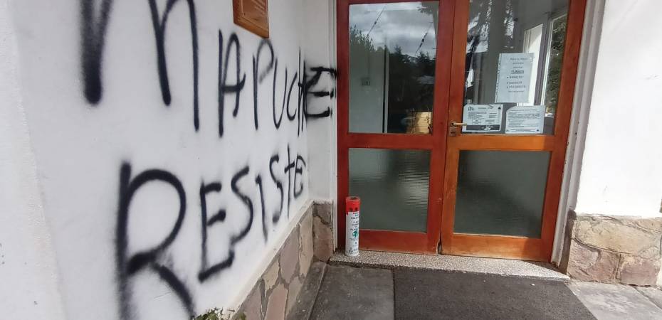 La secretaria de Desarrollo social, Marta Sobarzo, en sus redes sociales subió fotos de las pintadas en la entrada del edificio de desarrollo social en Villa la Angostura.