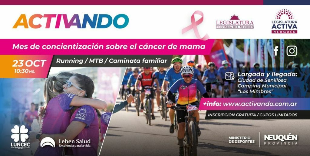 el camping municipal “Los Mimbres” en Senillosa, a partir de las 10.30. La carrera, con una caminata familiar e instancias competitivas y recreativas de running y MTB, es libre y gratuita. Por cupos limitados, las personas interesadas pueden inscribirse desde este sábado en la página oficial del programa: www.activando.com.ar .