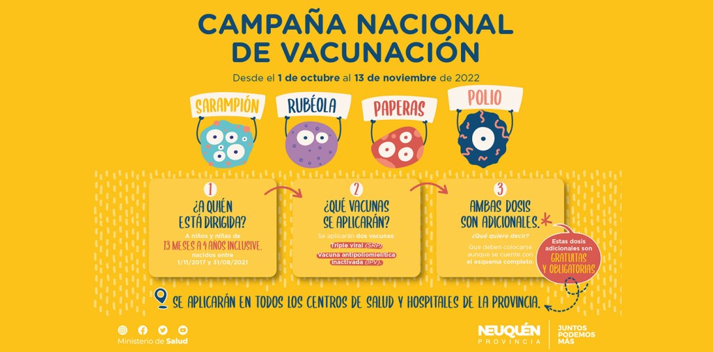 Las vacunas protegen de muchas enfermedades, son seguras y efectivas. Por ese motivo, se lleva adelante una Campaña Nacional de Vacunación contra sarampión, rubéola, paperas y polio destinada a niñas y niños de 13 meses a 4 años inclusive. Se trata de dosis adicionales de la vacuna triple viral (SRP) y la antipoliomielítica (IPV) que se aplican en el país cada cuatro años y corresponden al Calendario Regular, por lo que son gratuitas y obligatorias en la población objetivo.