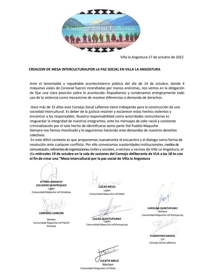En un comunicado de prensa, que no enviaron a este medio, pero que tomamos conocimiento a través del bloque de concejales del Frente de Todos, los referentes de las comunidades mapuches de la localidad convocan a todo el espectro político y social de la localidad y también a medios de prensa y autoridades locales y provinciales, tenia como fin que el día miércoles a las 19 hs se pudiera realizar una «Mesa Intercultural Para La Paz Social» en Villa la Angostura.