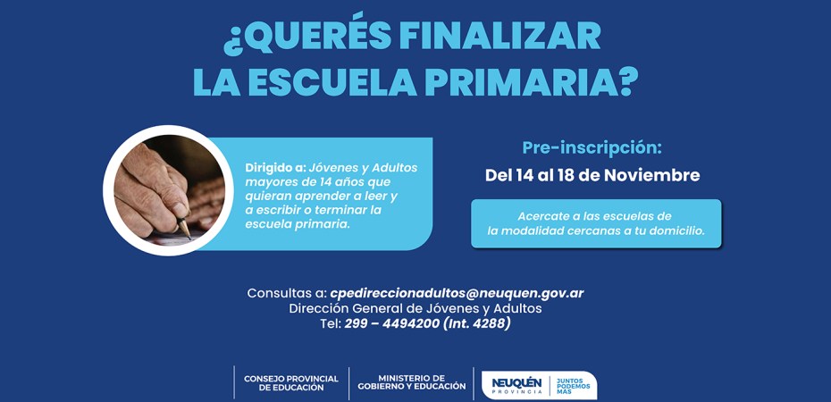 Como parte de la agenda de políticas públicas educativas, que genera acciones tendientes a garantizar el acceso a la educación, el ministerio de Gobierno y Educación y el Consejo Provincial de Educación (CPE) a través de la dirección general Modalidad Educación de Jóvenes y Adultos, informa que desde el 14 al 18 de noviembre estarán abiertas las preinscripciones para el próximo ciclo lectivo.