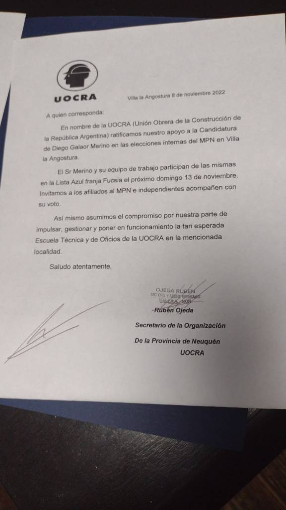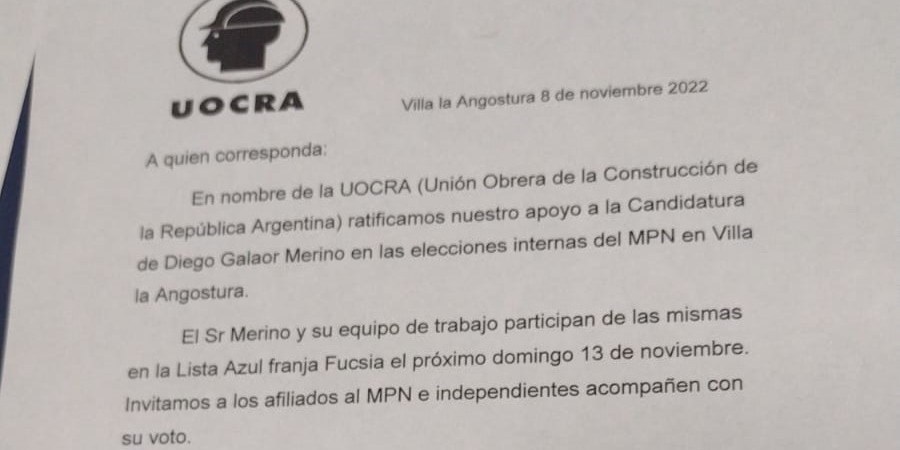Faltando pocos dias para la interna del MPN, Merino sigue sumando apoyos a su candidatura. Siendo un outsider para el mundillo político vernáculo, su particular estilo y formas, logro cosechar un importante apoyo de políticos, artistas, empresarios y ahora también del Sindicato UOCRA, que por medio de una carta manifestaron su apoyo a la candidatura local de merino.