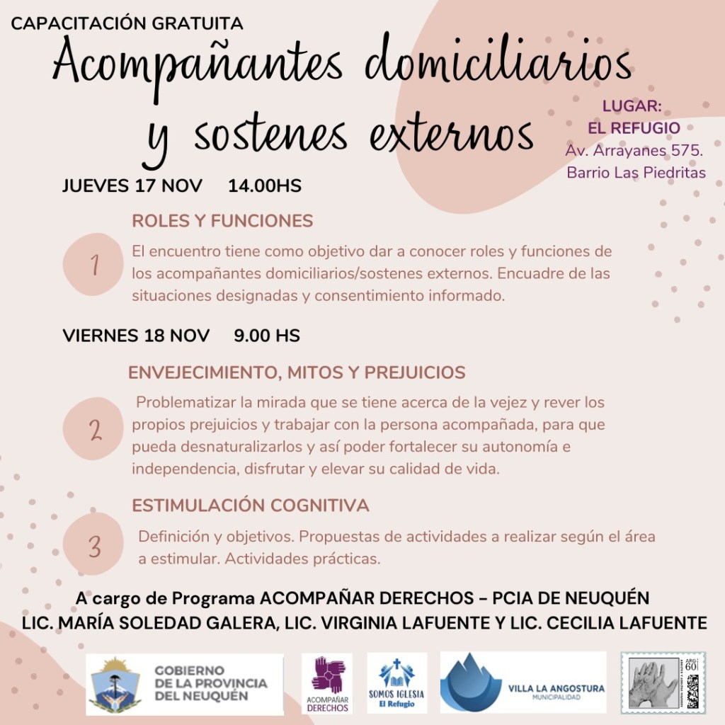 El Área de Personas Mayores de la Secretaría de Desarrollo Social invita a participar de una capacitación gratuita para personas que están desarrollando el rol de acompañantes domiciliarias y/o están en formación o actúan de sostén externo. Dicha jornada se realizará el día jueves 17 a las 14 horas y el viernes 18 de noviembre a las 9 horas en la iglesia El Refugio (Av. Arrayanes 575 – barrio Las Piedritas).