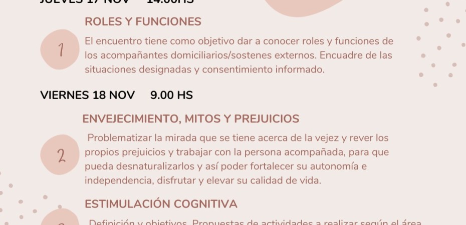 Jueves 17/11: Roles y funciones – El encuentro tiene como objetivo dar a conocer roles y funciones de los acompañantes domiciliarios/sostenes externos. Encuadre de las situaciones designadas y consentimiento informado.