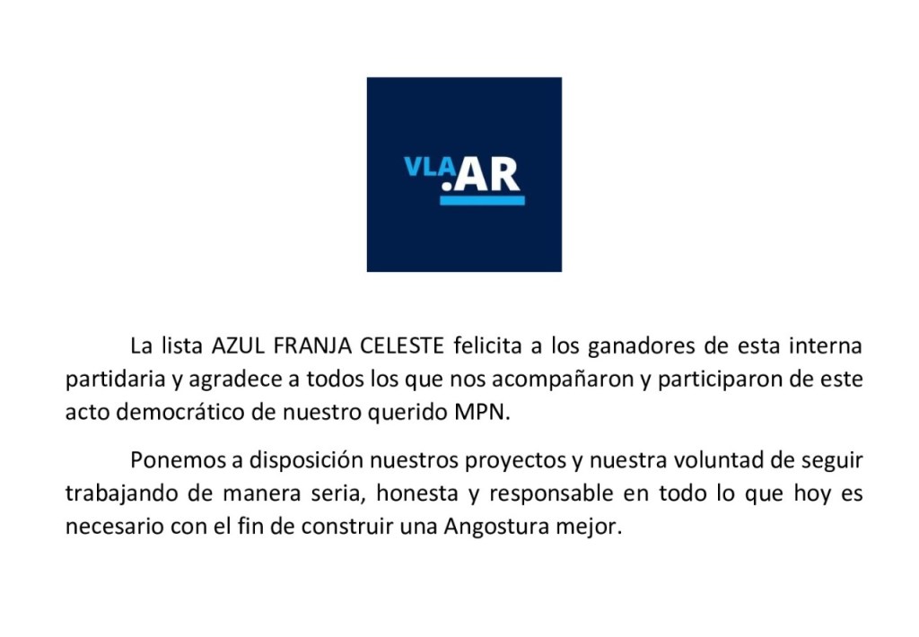 La lista AZUL FRANJA CELESTE felicita a los ganadores de esta interna partidaria y agradece a todos los que nos acompañaron y participaron de este acto democrático de nuestro querido MPN.