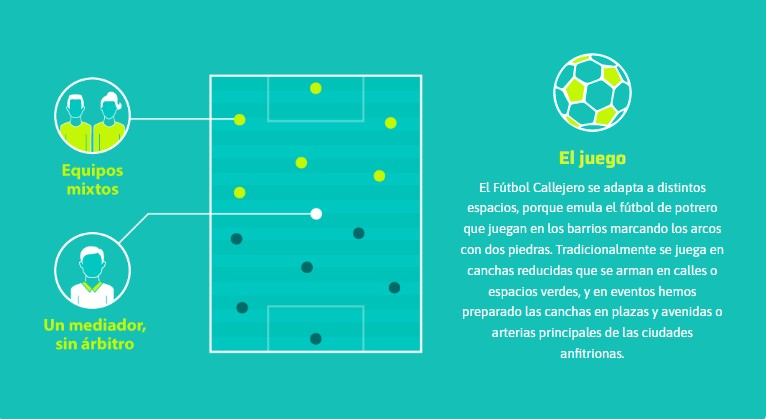 A diferencia de la modalidad tradicional, en el Fútbol Callejero no existe la figura del árbitro, los equipos son mixtos y las reglas se definen por consenso entre las y los participantes antes de comenzar. Por ejemplo, cómo se ejecutan los saques laterales, las duraciones de los tiempos o cómo se sanciona una falta grave.
