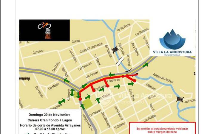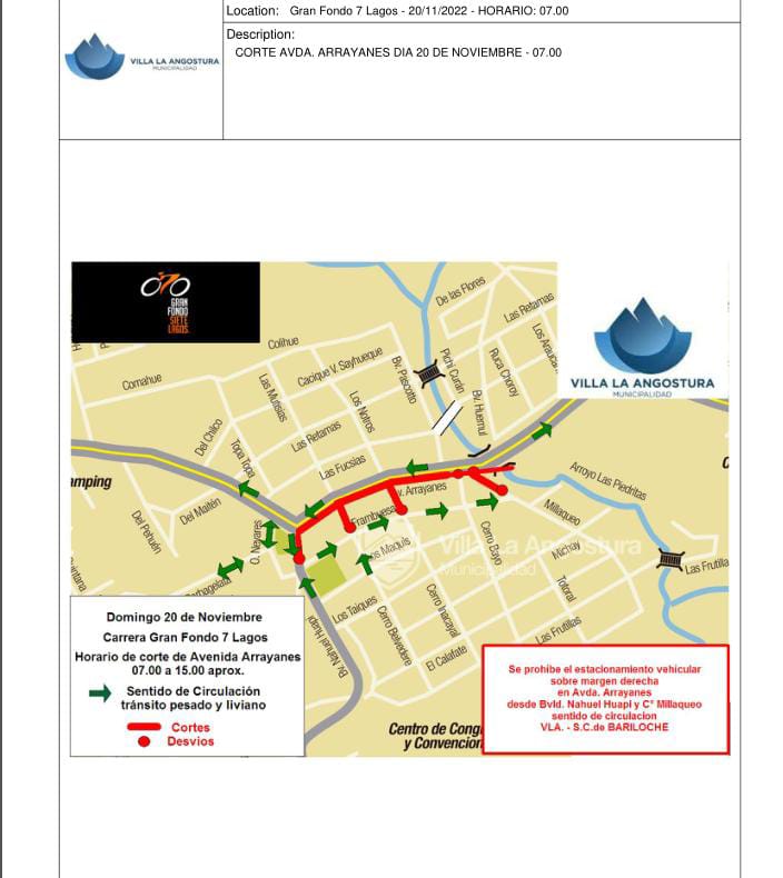 La Dirección de Tránsito y Transporte, dependiente de la Secretaria de Seguridad Ciudadana, Tránsito, Transporte y Protección Civil, informa a la comunidad del corte que se efectuará en la Av. Arrayanes el próximo domingo 20 de noviembre a partir de las 7 y hasta las 15 horas aproximadamente, por la realización de la carrera Gran Fondo 7 Lagos.