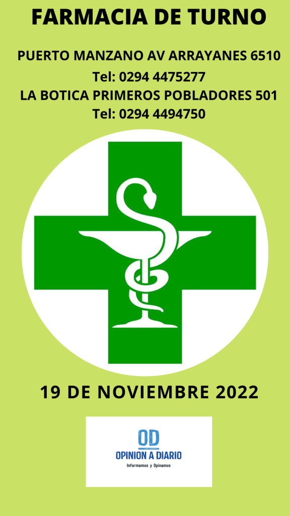 19 de noviembre, 202219 de noviembre, 2022 Opinión a Diario Farmacia de Turno para hoy sábado 19 de noviembre en Villa la Angostura Neuquén Se recuerda que los turnos comienzan 08.30 hs. dia cartelera hasta las 08.30 hs. del día siguiente Relacionado