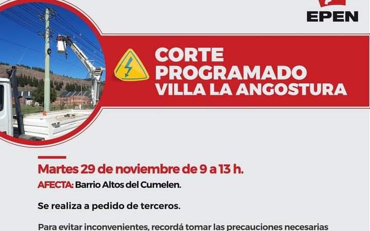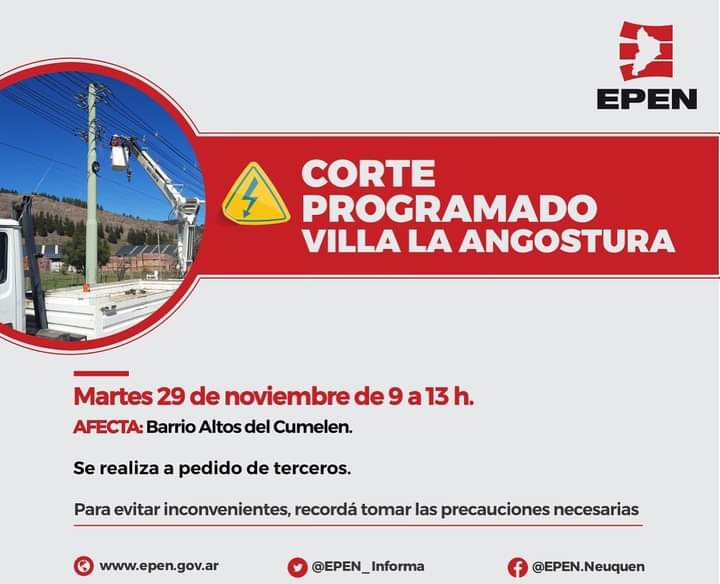 El Ente Provincial de Energía del Neuquén informa que realizará un corte de energía a pedido de terceros. Según el siguiente detalle: