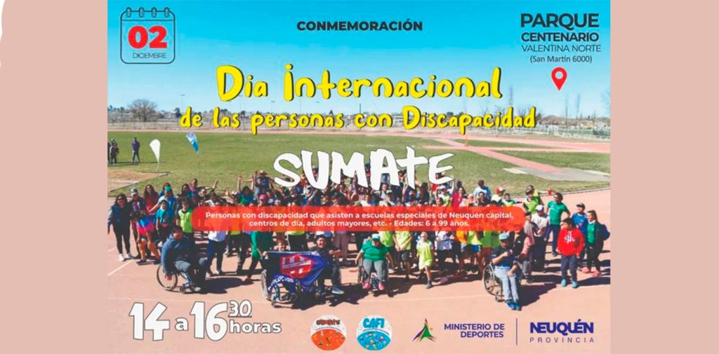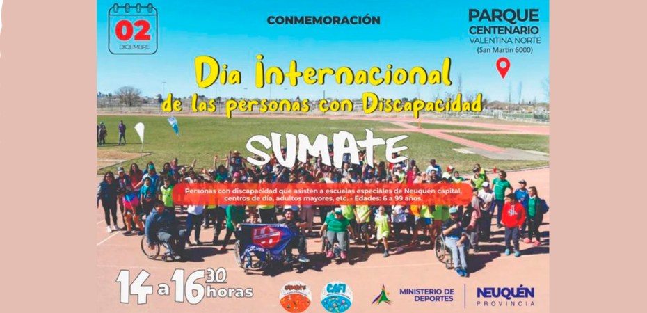 Con motivo de la conmemoración del Día Internacional de las Personas con Discapacidad, Hoy de 14 a 16.30 se llevará a cabo en el Parque Valentina Norte una actividad deportiva organizada por el ministerio de Deportes destinada a escuelas especiales de Neuquén capital, centros de día y adultos mayores.