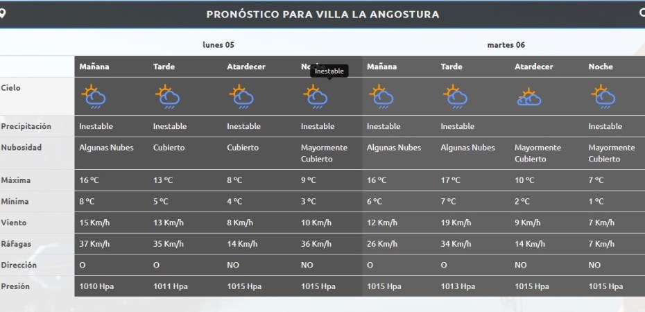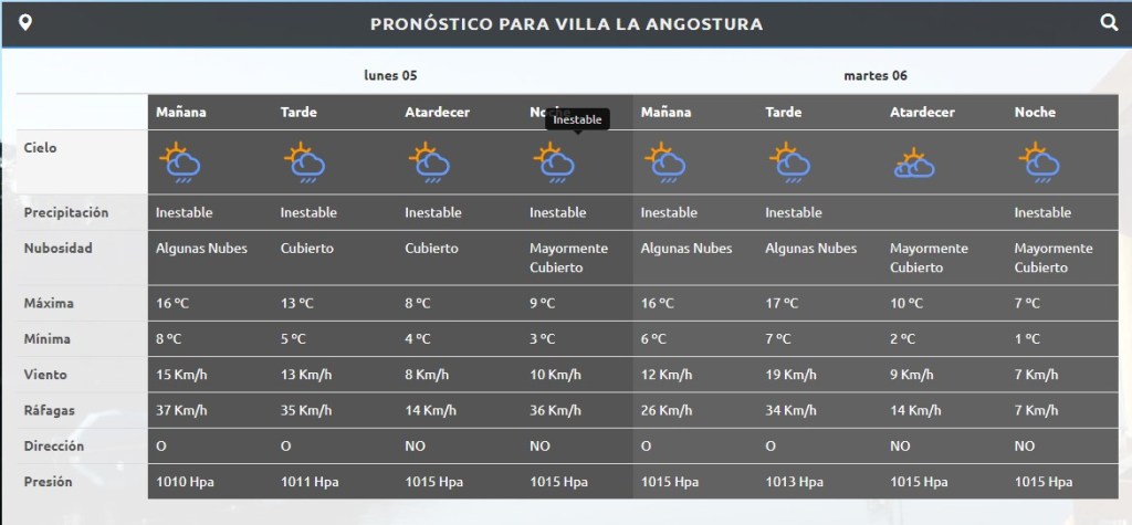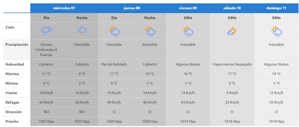 Principios de semana, parcial nublado y templado, viento moderado del oeste-sudoestes. mediados de semana ingresa un sistema frontal en área cordillerana, provocará lluvias débiles a moderadas, los días miércoles 7 y jueves 8 en alta montaña, períodos de viento fuerte y descenso de la temperatura.
