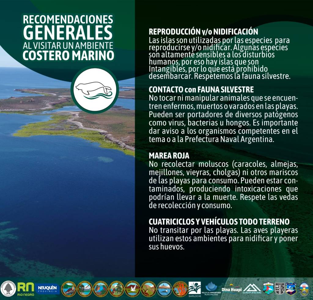 • No tocar ni manipular animales que se encuentren enfermos, muertos o varados en las playas. Pueden ser portadores de diversos patógenos como virus, bacterias u hongos. Es importante dar aviso a los organismos competentes en el tema o a la Prefectura Naval Argentina.