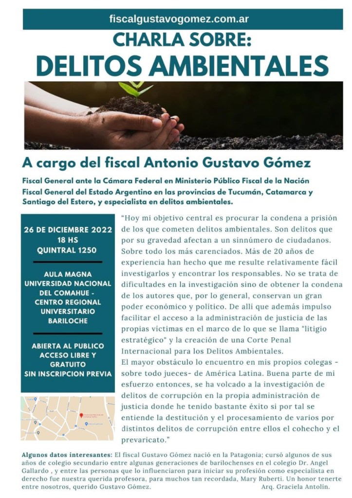 La charla que se realizara hoy en el Centro Regional Universitario Bariloche (CRUB) de la Universidad Nacional del Comahue (Quintral 1250), estará a cargo de Antonio Gustavo Gómez, Fiscal General ante la Cámara Federal en Ministerio Público Fiscal de la Nación , Fiscal General del Estado Argentino en las provincias de Tucumán, Catamarca y especialista en delitos ambientales.
