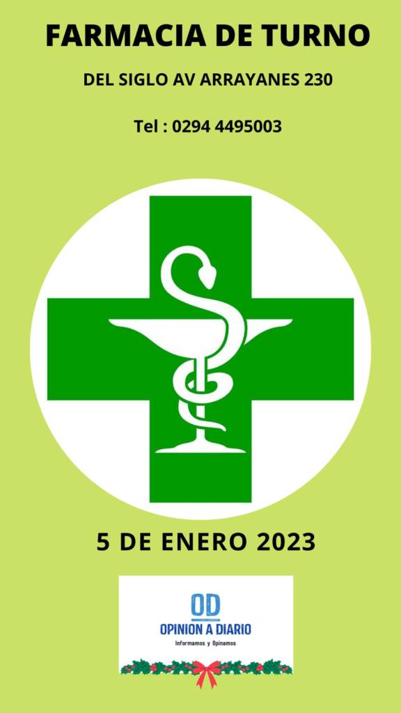 5 de enero, 2023 Opinión a Diario Farmacia de turno para hoy, jueves 5 de enero en Villa La Angostura, Neuquén. Relacionado