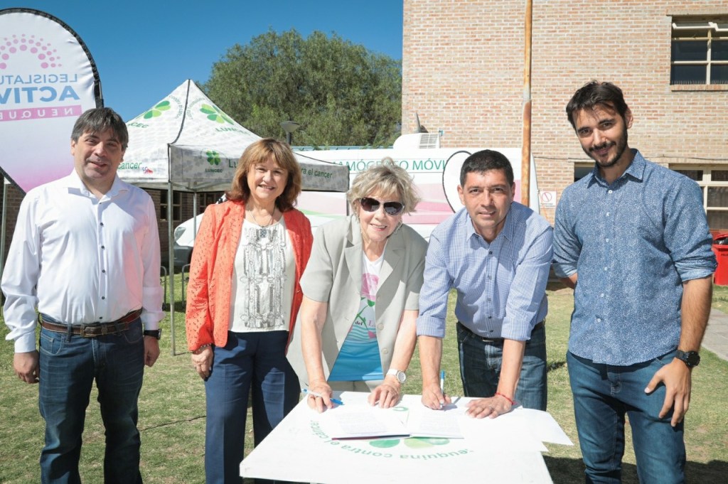 El vicegobernador Marcos Koopmann firmó hoy con la presidenta de la Asociación Civil Lucha Neuquina Contra el Cáncer (LUNCEC), Nora Serrano de Salvatori, un convenio para continuar durante este año con el trabajo en conjunto de concientización, prevención, testeo y diagnóstico precoz de enfermedades oncológicas que viene realizando la asociación en conjunto con la Legislatura, a través del funcionamiento del mamógrafo móvil. El acuerdo contempla, al igual que en 2022, que el móvil recorrerá el interior de la provincia y el funcionamiento de un odonto móvil para prevención y atención primaria en salud bucal.