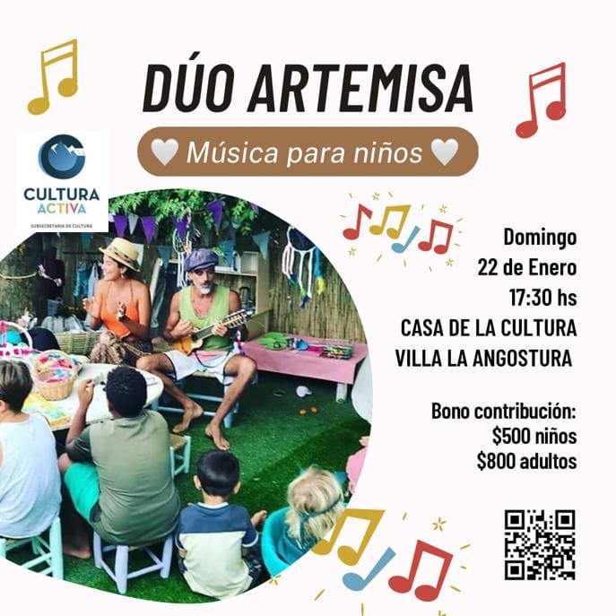 La Subsecretaría de Cultura, invita a disfrutar del espectáculo de música para niños “Dúo Artemisa”, el domingo 22 de enero a las 17.30 horas en la Casa de la Cultura (Las Frambuesas 32).