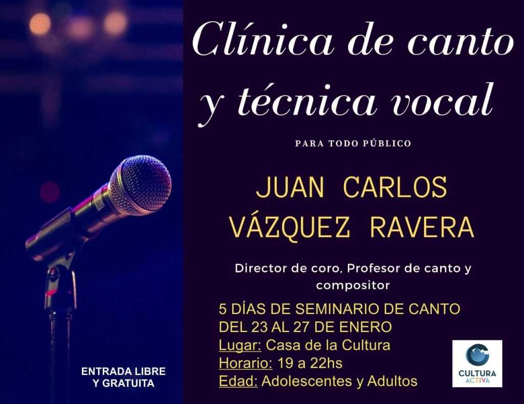 La Subsecretaría de Cultura, dependiente de la Secretaría de Gobierno, invita a participar de un taller gratuito: “Clínica de canto y técnica vocal”, dictado por Juan Carlos Vázquez Ravera (director de coro, profesor de canto y compositor).