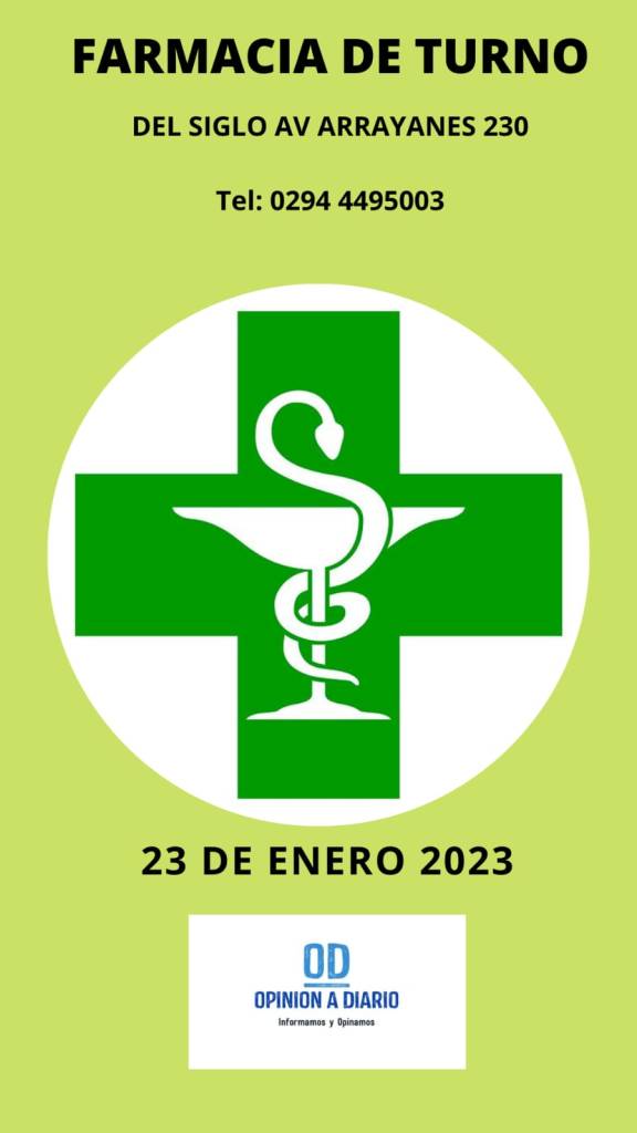 23 de enero, 2023 Opinión a Diario Farmacia de turno para hoy lunes 23 de Enero, en Villa la Angostura, Neuquén. Relacionado
