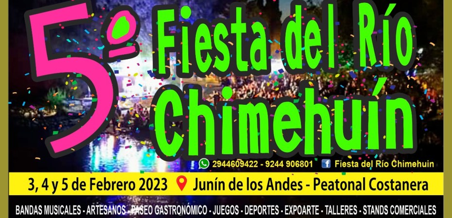 La Fiesta Provincial del Río Chimehuín se llevará a cabo del 3 al 5 de febrero en la avenida Costanera de Junín de los Andes. Contará con espectáculos de artistas locales, regionales y nacionales, además de actividades recreativas y deportivas, y los tradicionales stands comerciales y paseos de artesanos, gastronómicos y cerveceros.