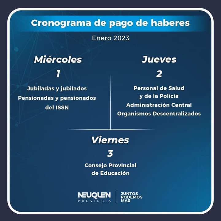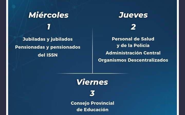 El miércoles comenzará el cronograma de pago de haberes a la administración pública de la provincia. El 1 de febrero cobrarán los sueldos de enero jubilados y pensionados del ISSN; el jueves 2 será el turno de los agentes de Salud, Policía, Administración Central y organismos descentralizados, mientras que el viernes 3 percibirán sus haberes los empleados dependientes del Consejo Provincial de Educación.