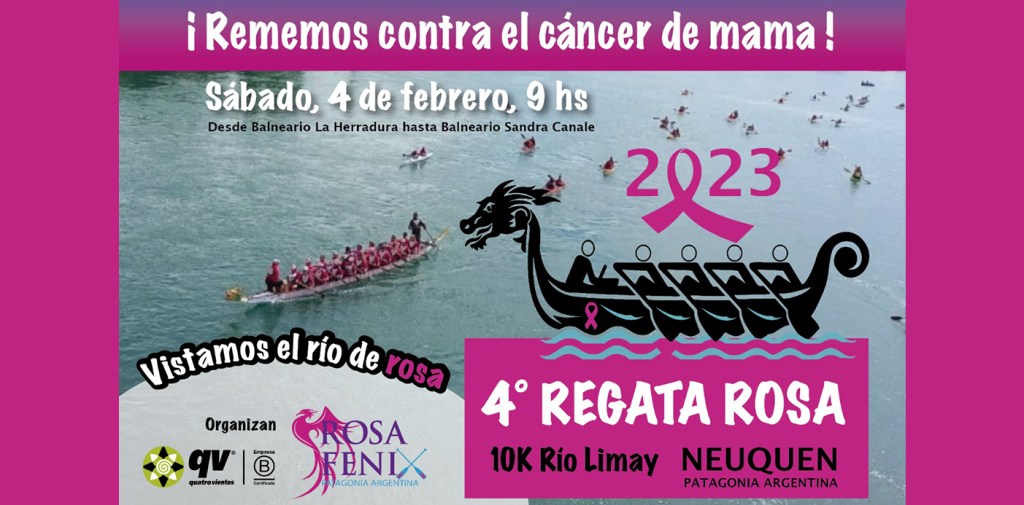 El sábado 4 de febrero desde las 9 hs. en el Río Limay se llevará a cabo la 4° edición de la regata Rosa bajo el lema «Vistamos el río de Rosa». La actividad, que comenzará a las 9, busca promocionar el canotaje recreativo en el marco de la campaña contra el cáncer de mama promovida por el grupo Rosa Fénix.