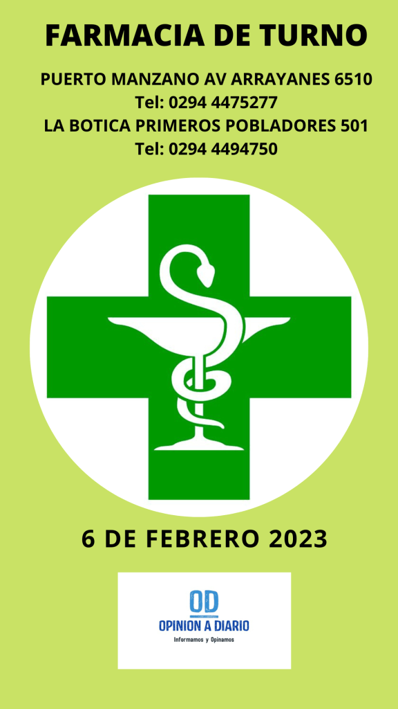 6 de febrero, 2023 Opinión a Diario Farmacia de Turno para hoy lunes 6 de febrero en Villa La Angostura, Neuquén Relacionado
