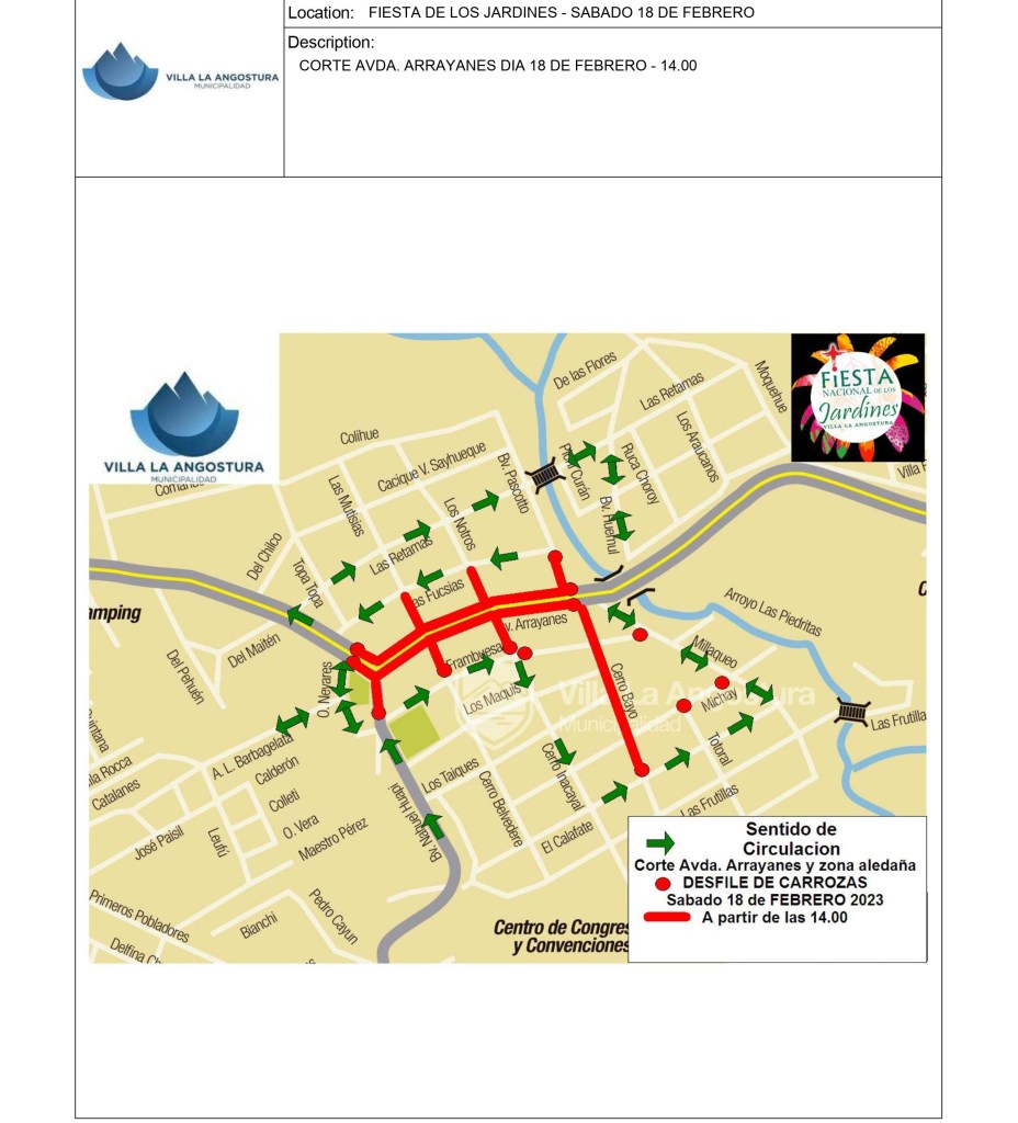 La Dirección de Tránsito y Transporte, dependiente de la Secretaría de Seguridad Ciudadana, Tránsito, Transporte y Protección Civil, informa que, en el marco de la 10° Fiesta Nacional de los Jardines, se realizará un corte de calles céntricas el día sábado 18 de febrero a partir de las 14:00 y hasta las 20:00 horas aproximadamente, por llevarse adelante el Desfile de Carrozas.