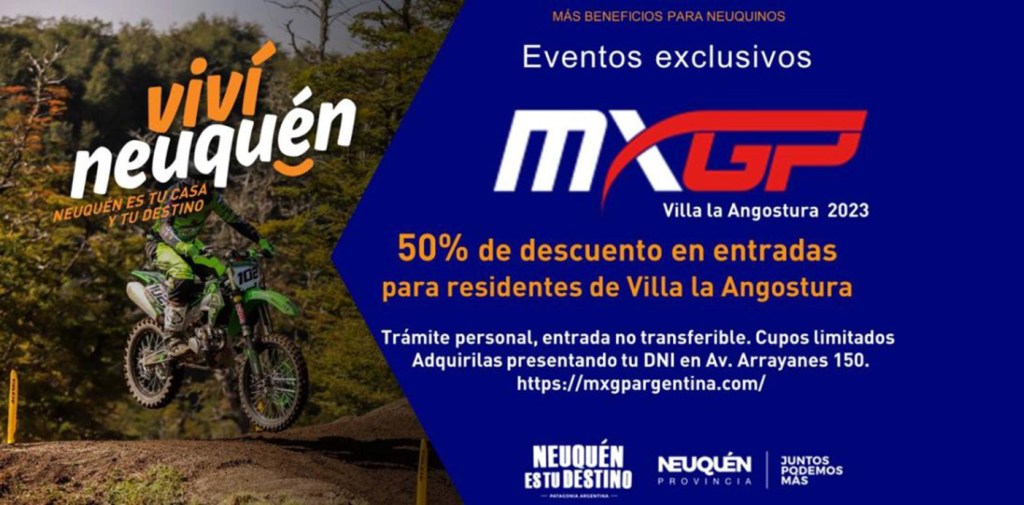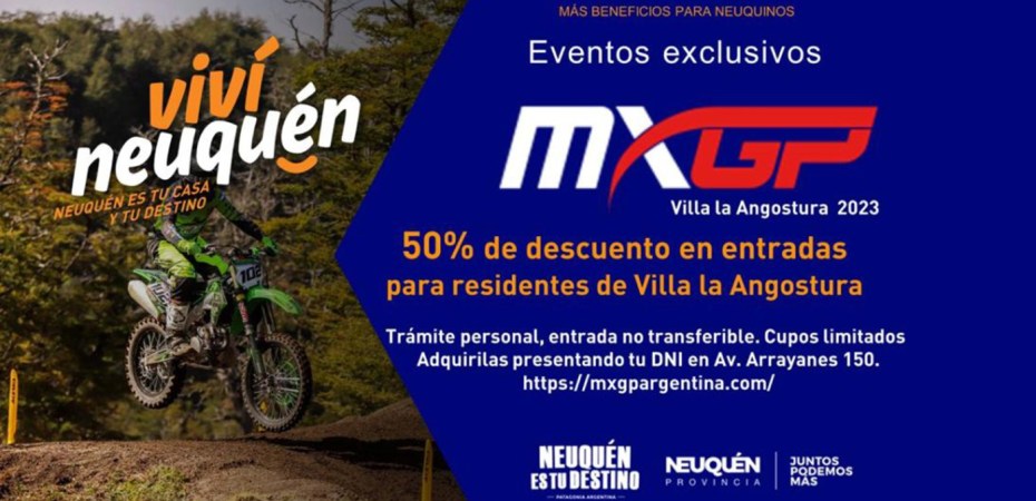 El ministerio de Turismo a través del programa Viví Neuquén brinda descuentos a residentes de Villa La Angostura para asistir a la primera fecha del Campeonato Mundial de Motocross que se disputará el 11 y 12 de marzo en dicho destino. El beneficio consiste en un descuento del 50 % en la compra de entradas para el evento.