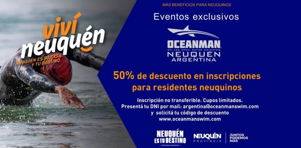 En el caso de Oceanman, el Campeonato Internacional de Nado en Aguas Abiertas, que se realizará el 18 y 19 de marzo en Villa La Angostura, el programa Viví Neuquén brindará beneficios del 50 % en la inscripción para participar del evento.