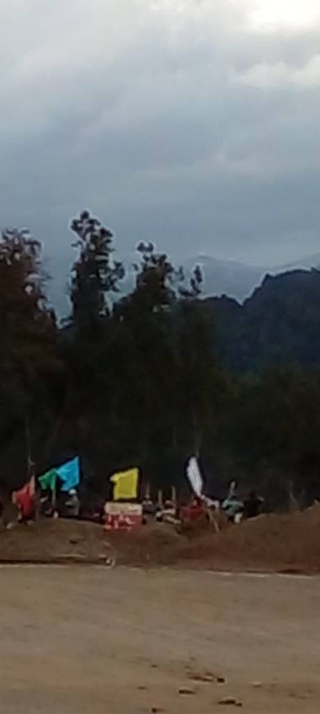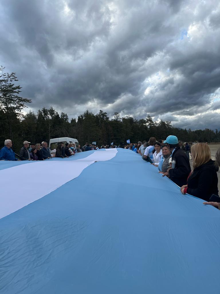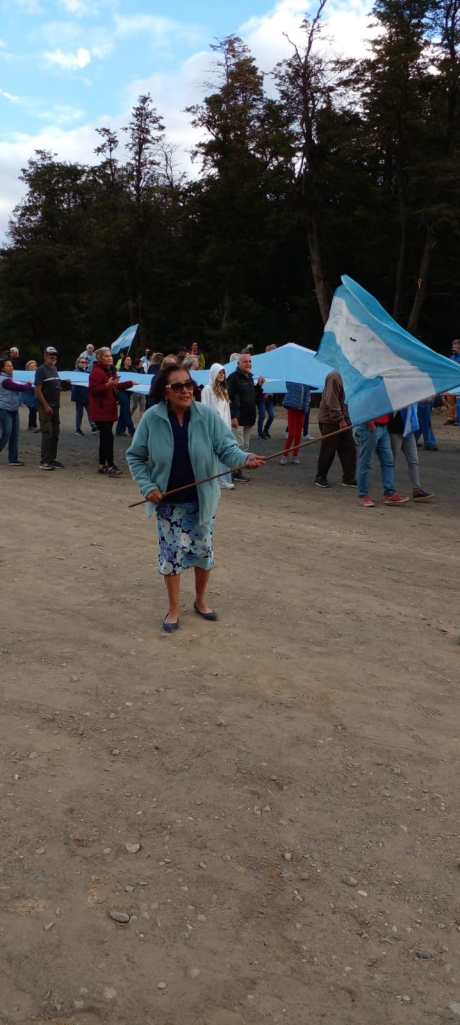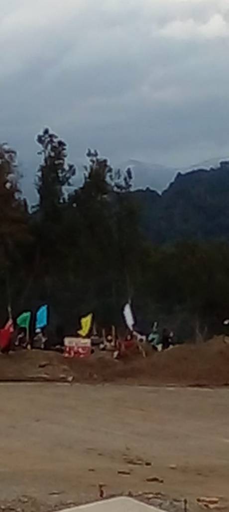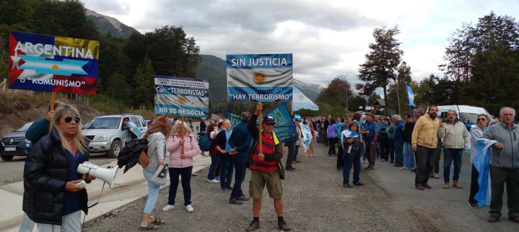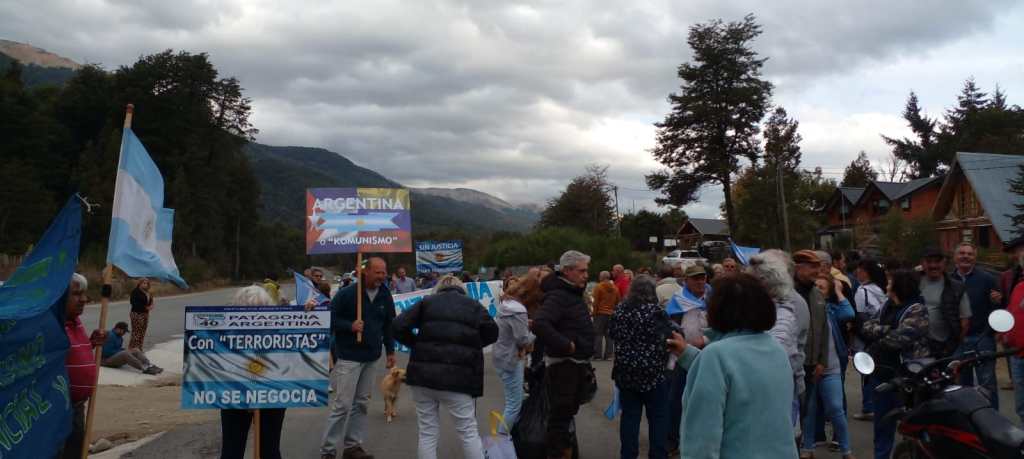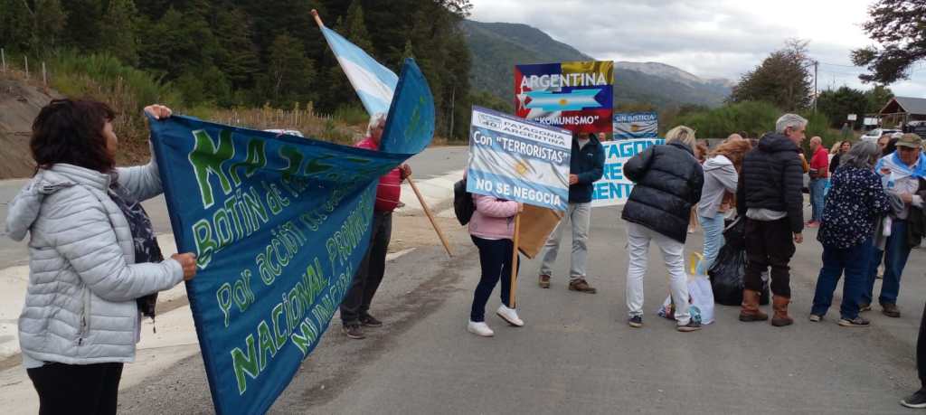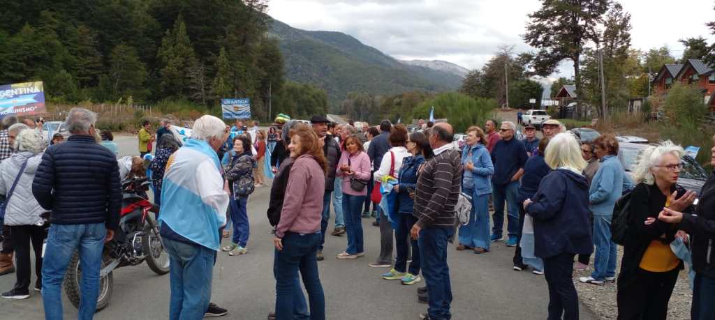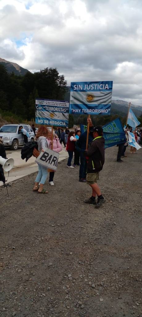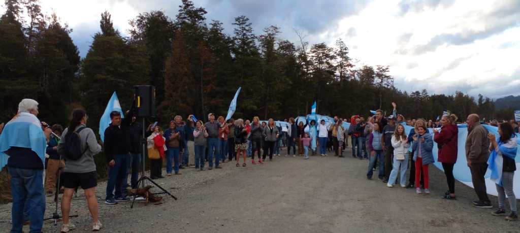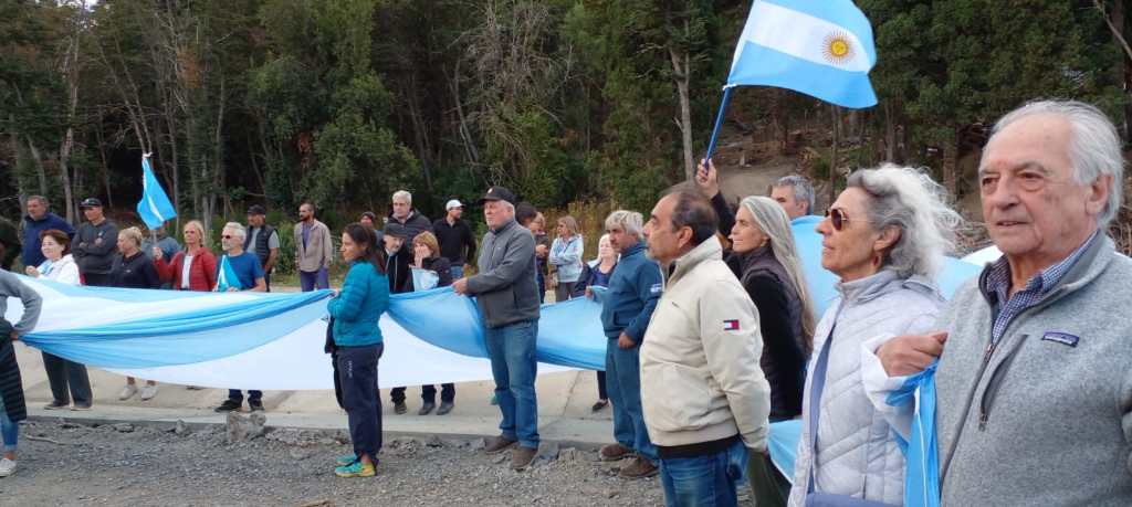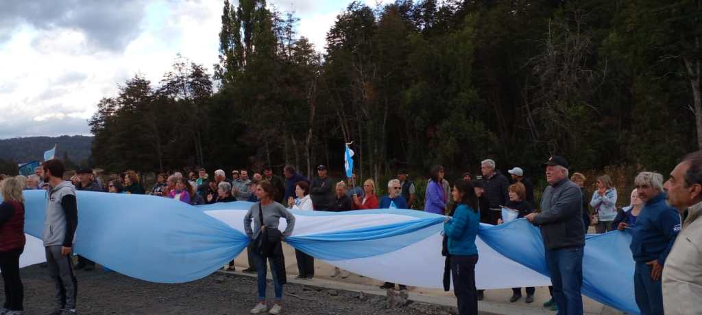 Vecinos de Villa la Angostura, identificados solo con banderas Argentinas, se reunieron para pedir que se termine con la ruta de circunvalación, que actualmente está siendo impedida de continuar por una toma de la traza por parte de integrantes de una Toma de Tierras cercanas que se encuentra demasiado cerca de la traza original y además también por parte de los integrantes de la comunidad mapuche.