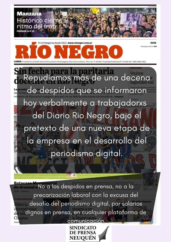 El Sindicato de Prensa de Neuquen repudia más de una decena de despidos que se informaron hoy verbalmente a trabajadores del Diario Rio Negro, bajo el pretexto de una nueva etapa de la empresa en el desarrollo del periodismo digital.