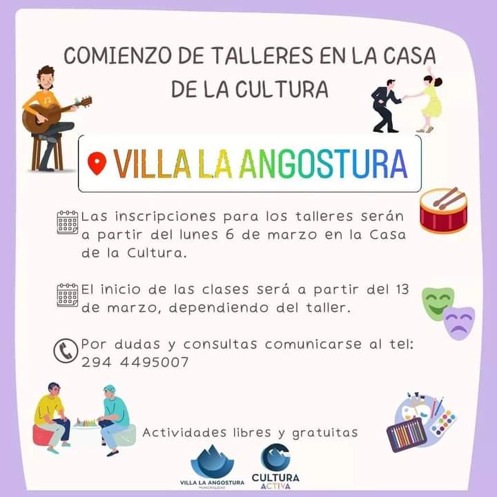 Para dudas o consultas, comunicarse al (02944) 495007 o por correo electrónico a cultura@villalaangostura.gov.ar. Instagram: @cultura.vla