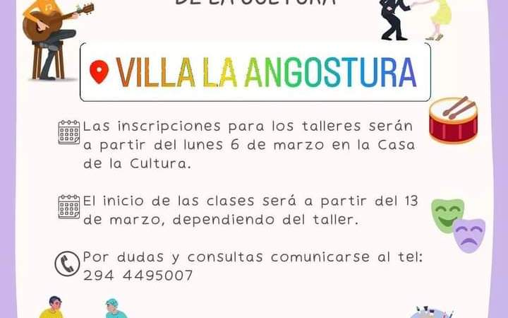 Para dudas o consultas, comunicarse al (02944) 495007 o por correo electrónico a cultura@villalaangostura.gov.ar. Instagram: @cultura.vla