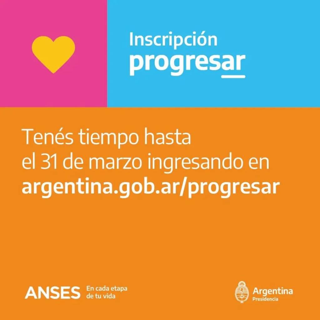 El plan orientado a los jóvenes de 16 a 24 años, que estén cursando en forma regular en una institución educativa anuncia que hasta el 31 de marzo se puede ingresar a https://www.argentina.gob.ar/educacion/progresar