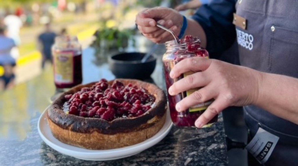 Para cerrar, la edición 2023 del festival Yo Como, la chef Jimena Monteverde, deleitó a los presentes con elaboraciones dulces, una tarta campesina de peras, manzanas y almendras, además de una torta alfajor de chocolate y frambuesas.