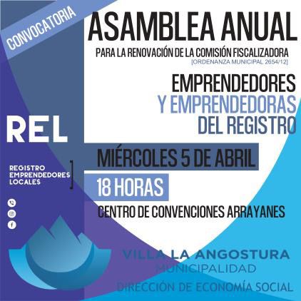 La Dirección de Economía Social convoca a los emprendedores registrados a la Asamblea Anual, según Ordenanza 2654/12. La misma se realizará en el Centro de Convenciones Arrayanes, el próximo miércoles 5 de abril a las 18 hs.