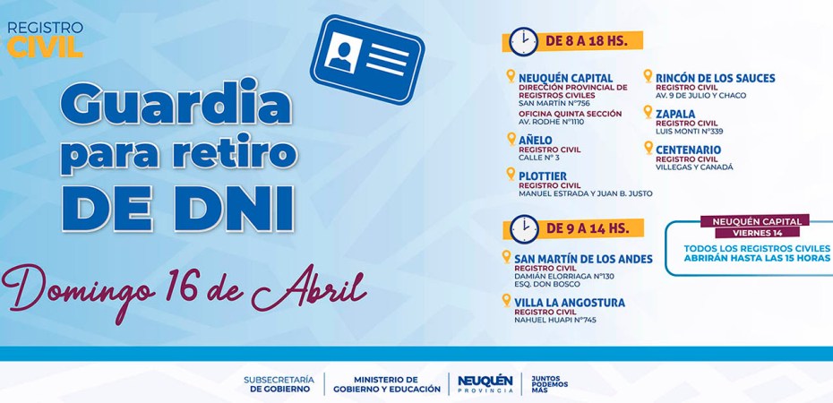 La Dirección Provincial de Registros Civiles, área dependiente del ministerio de Gobierno y Educación anunció que las oficinas de los Registros Civiles de Zapala, Centenario, Plottier, Añelo, Villa La Angostura, San Martín de los Andes, Rincón de los Sauces, la Dirección Provincial de Registros Civiles y la Quinta Seccional de Neuquén capital abrirán el domingo 16 para el retiro de documentación.