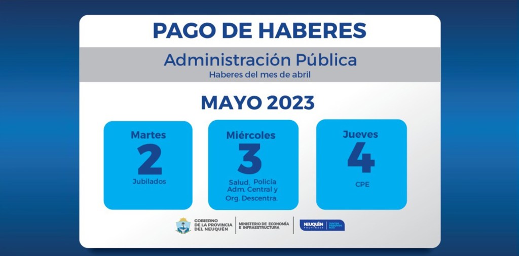El ministerio de Economía e Infraestructura informa que hoy martes, 2 de mayo, iniciará el cronograma de pago de haberes de la administración pública provincial correspondiente al mes de abril. Los primeros en cobrarlos serán los jubilados y pensionados del Instituto de Seguridad Social del Neuquén.