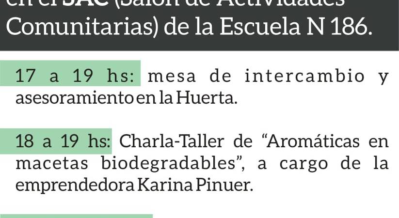 · 18 a 19hs: Charla taller de «Aromáticas en macetas Biodegradables», a cargo de la emprendedora Karina Pinuer.