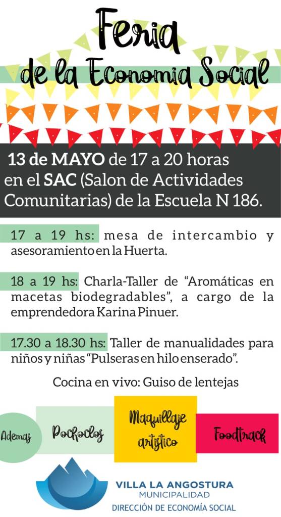 La Dirección de Economía Social invita a la comunidad a la Feria de la Economía Social que se llevará a cabo el día sábado 13 de mayo, de 17 a 20 hs en el SAC (Salón de Actividades Comunitarias) de la Escuela 186.