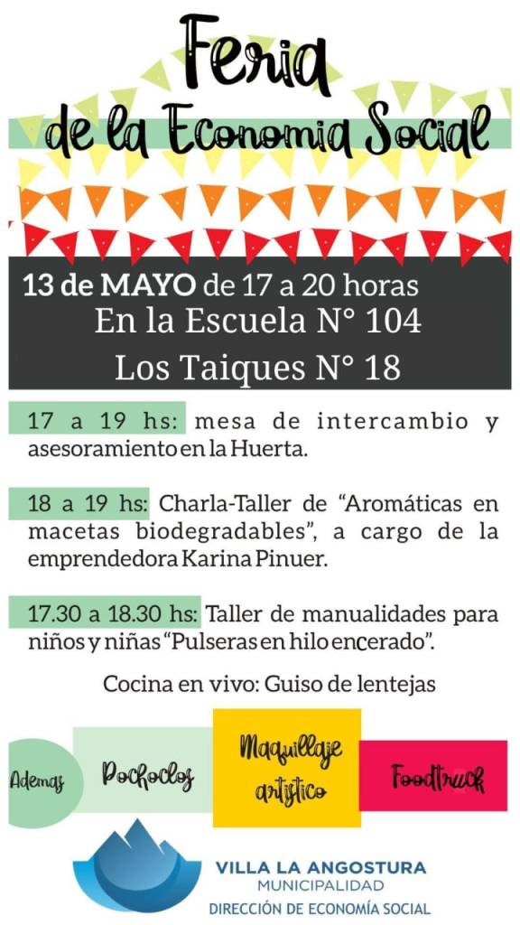 La Dirección de Economía Social invita a la comunidad a la Feria de la Economía Social que se llevará a cabo el día sábado 13 de mayo, de 17 a 20 hs en la Escuela 104 (CAMBIÓ EL LUGAR DE REALIZACIÓN DE LA FERIA).