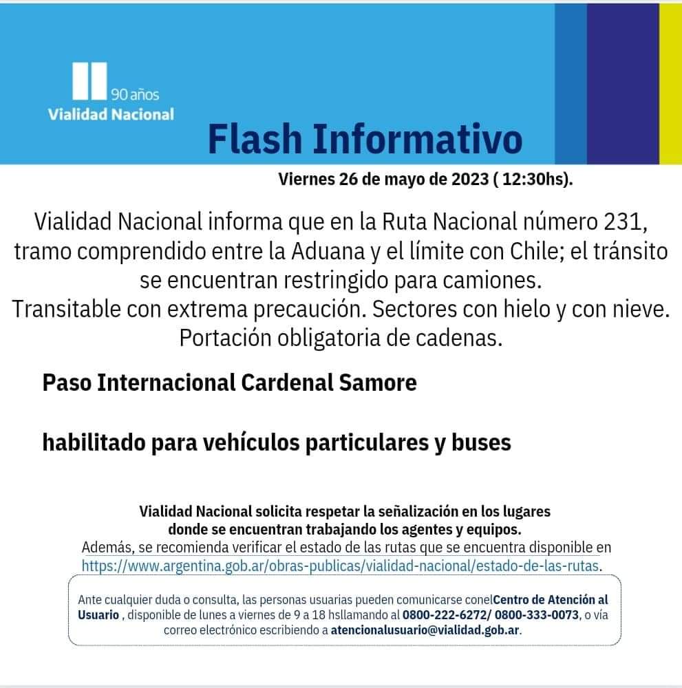 26 de mayo, 2023 Opinión a Diario 26/5 actualización paso cardenal samore. Habilitación parcial. Habilitan el tránsito de autos particulares y Micros solo con portacion de cadenas obligatorio. Camiones restringido. Relacionado