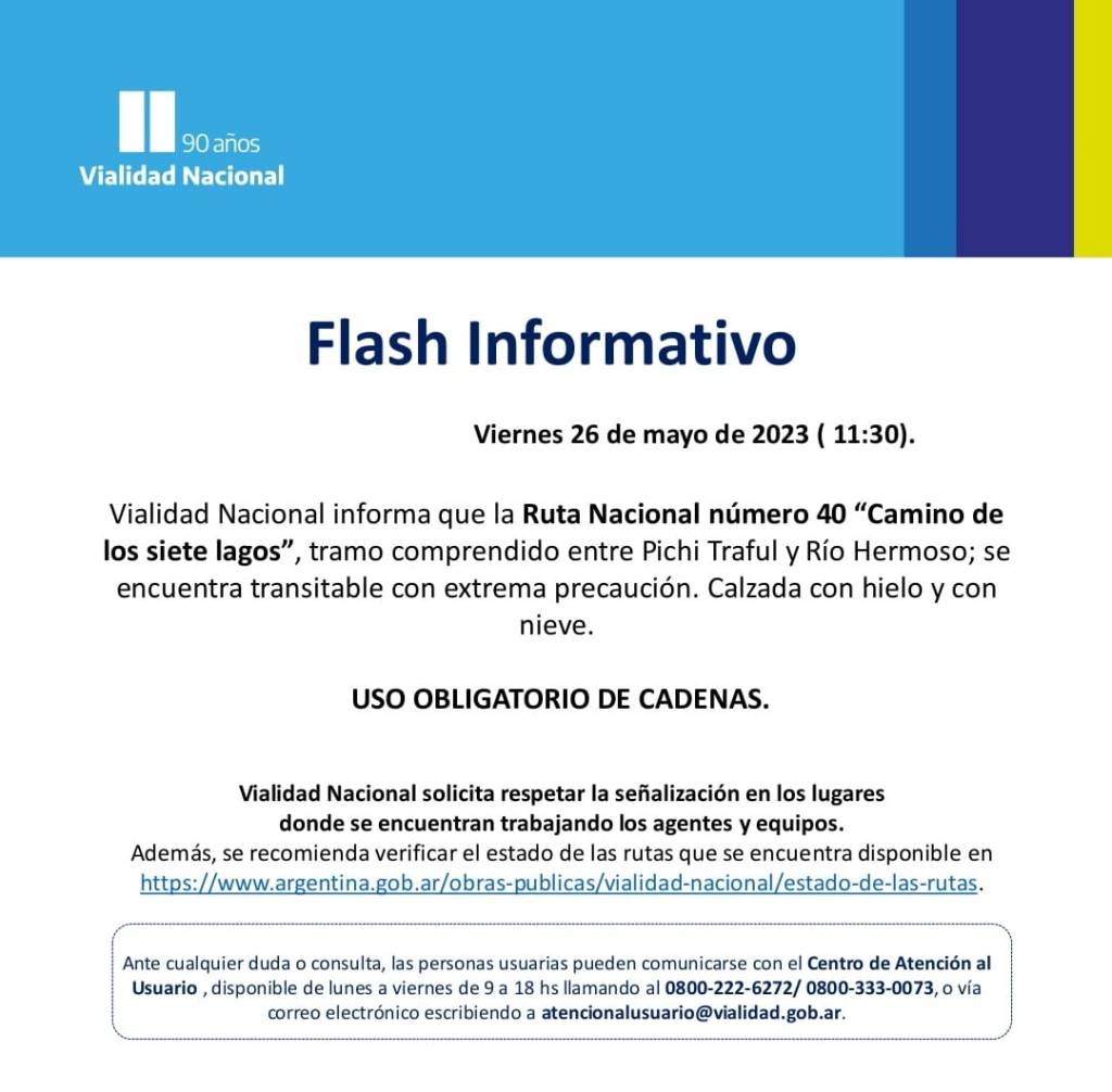 26 de mayo, 2023 Opinión a Diario 26/5 Ruta 7 Lagos tramos con nieve y USO de cadenas OBLIGATORIO. Principalmente en el tramo entre Pichi Traful y Rio Hermoso. Relacionado