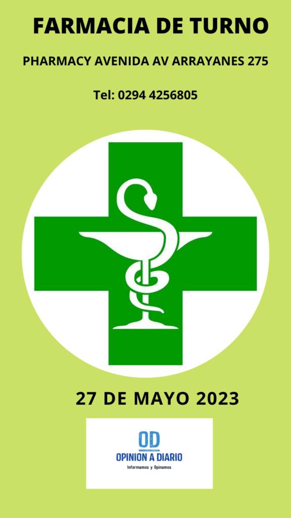 27 de mayo, 2023 Opinión a Diario Farmacia de Turno para hoy, Sábado 27 de Mayo en Villa la Angostura Neuquen. Relacionado