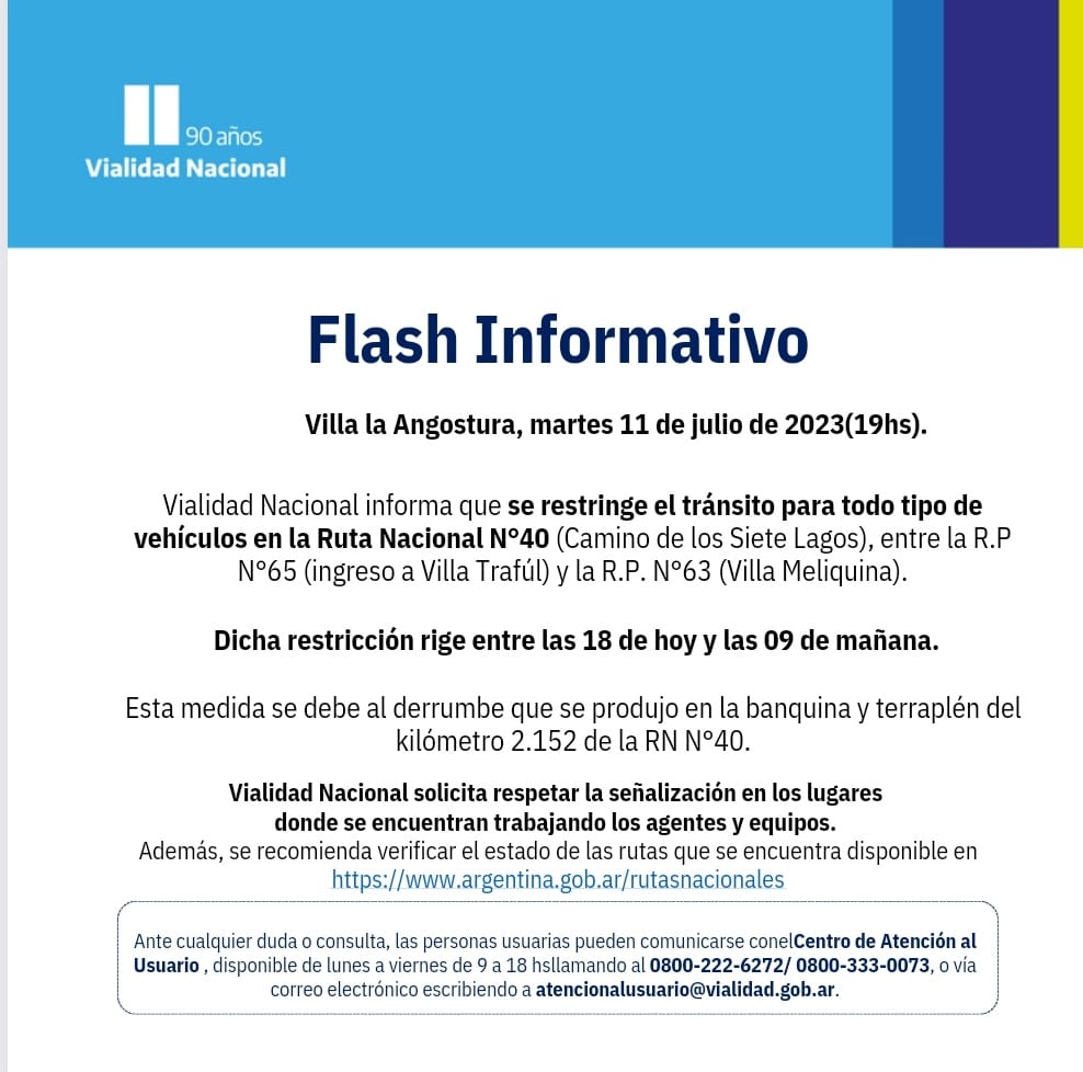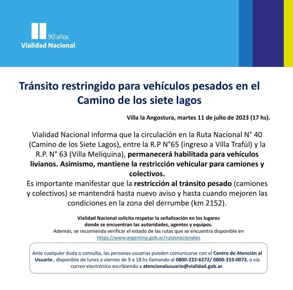 En un parte de las 17 hs, Vialidad nacional informo las nuevas medidas y restricciones para el camino de los 7 lagos en el tramo comprendido entre la entrada a Villa Traful y la del lago meliquina.