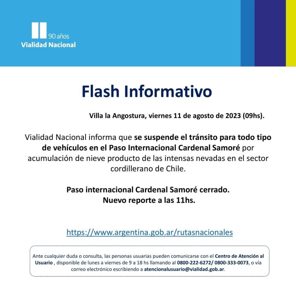 En un parte de prensa, Vialidad Nacional anuncia el cierre del paso cardenal samore para todo tipo de vehículos para el día de hoy.