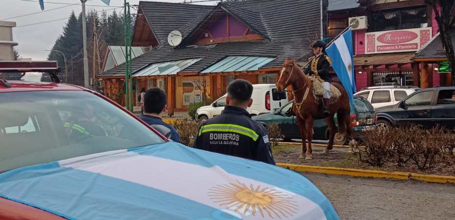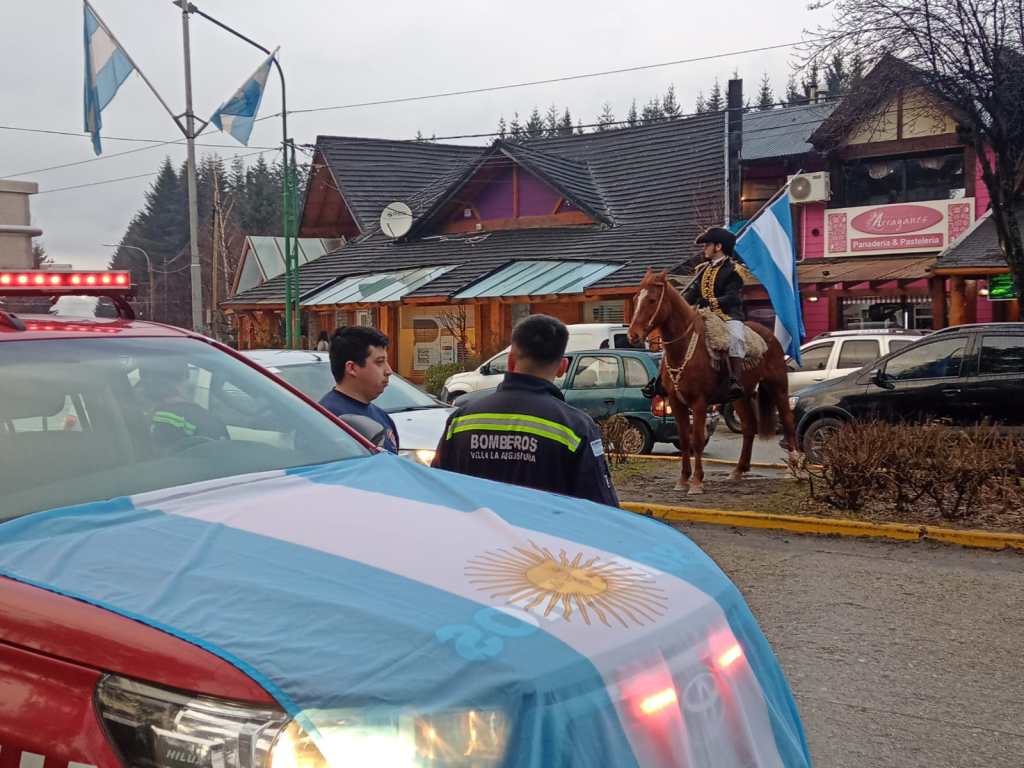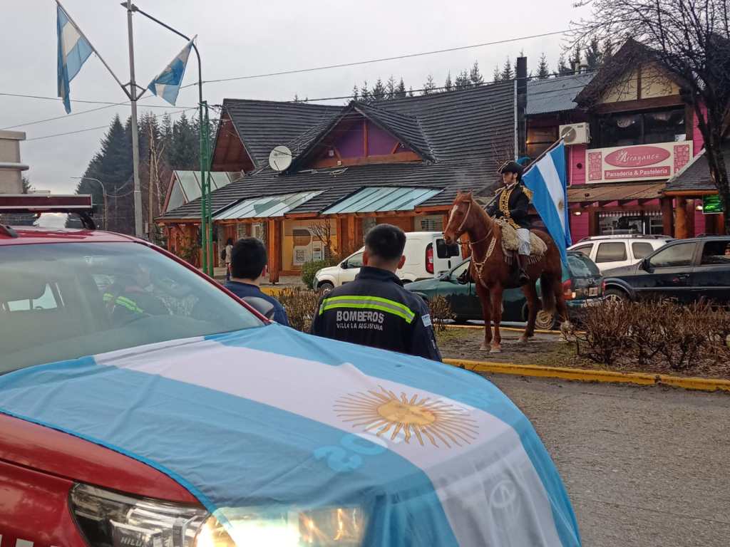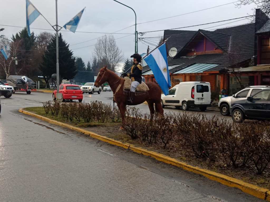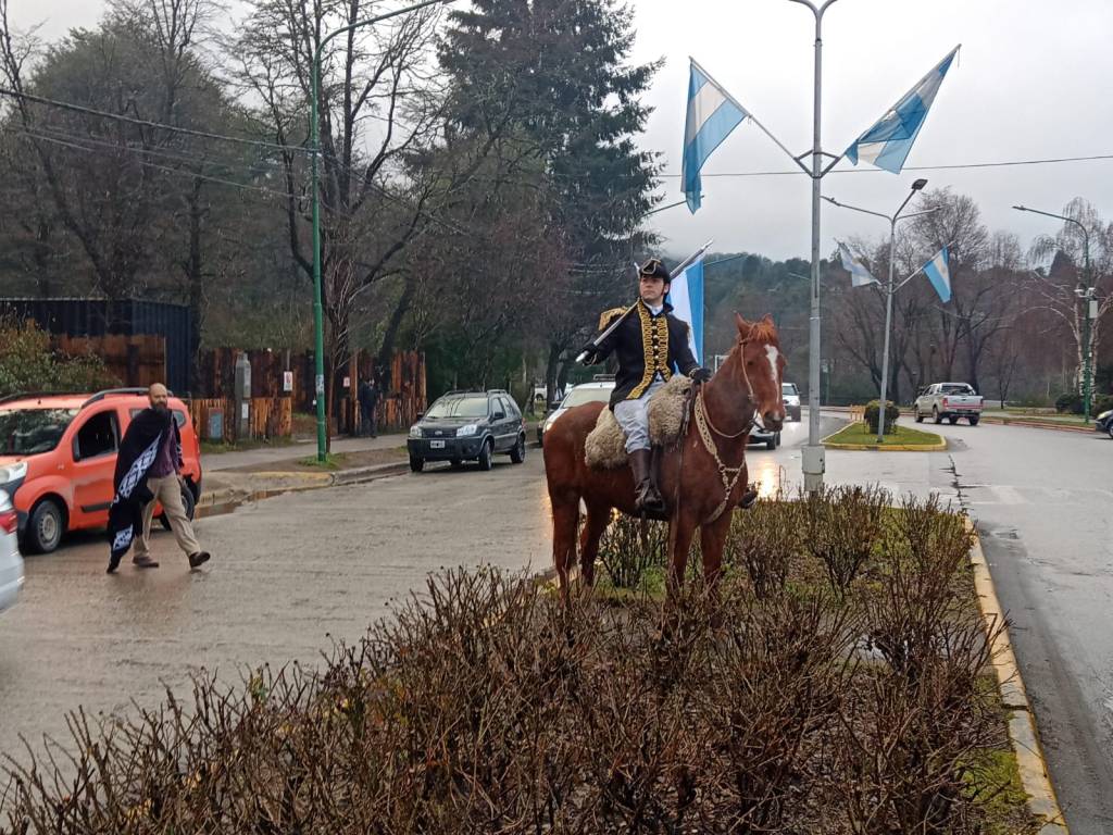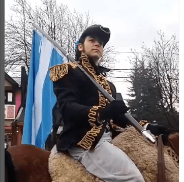 Leo Vásquez un actor profesional de Villa la Angostura que además es propietario de Cabalgatas el Tero de Villa la Angostura, personifico al Padre de la patria y en el aniversario de su fallecimiento salio a recorrer a caballo el centro de la localidad.