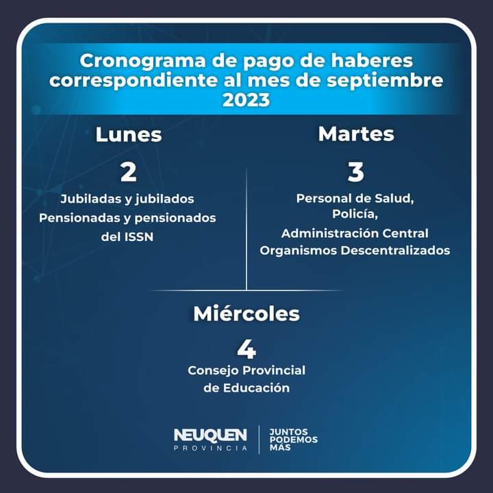 Los días 2, 3 y 4 de octubre percibirán sus haberes jubilados, pensionados y trabajadores del Estado provincial neuquino.