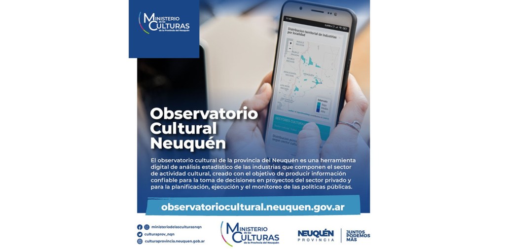 El observatorio cultural de la provincia del Neuquén es una herramienta digital de análisis estadístico de las industrias que componen el sector de actividad cultural, creado con el objetivo de producir información confiable para la toma de decisiones en proyectos del sector privado y para la planificación, ejecución y el monitoreo de las políticas públicas.