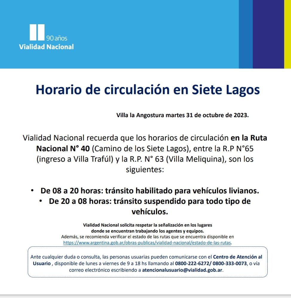 La restricción de transito se aplica entre el ingreso a Villa Traful y Meliquina y es para todo tipo de vehículos de 20 a 8 horas.